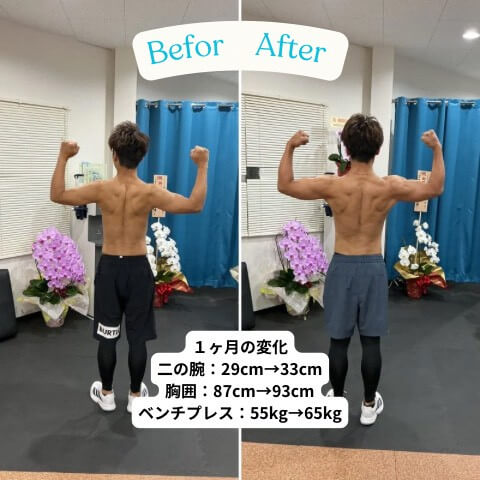 二の腕29cmから33cm、胸囲は87cmから93cm、ベンチプレスは55㎏から65kgに。たった一ヶ月で筋肉力が増量し、魅力的な身体に変化しました。