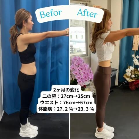 2ヶ月で二の腕27cmから25cm、ウエストは76cmから67cm、体脂肪率は27.2%から23.3%に!トレーニング開始からどんどんと身体が引き締まり、スリムなモデル体型に仕上がりました。